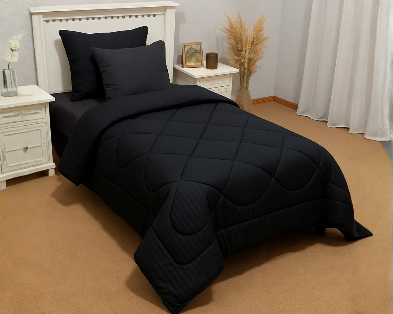 ست لحاف تکنفره ٤ تکه؛ شامل: لحاف دورویه(زیره: میکرو، رویه: هتلی ژاکارد) - ملحفه کشدار میکرو ساده - ١ عدد روبالشتی هتلی ژاکارد - ١ عدد روبالشتی میکرو ساده.