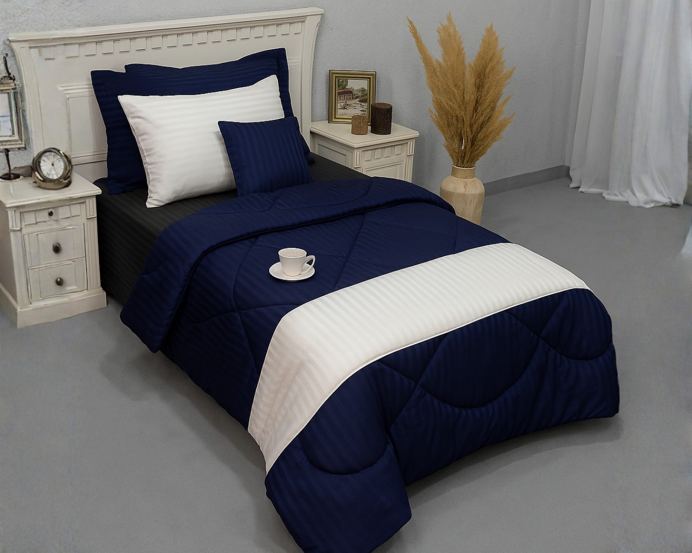ست لحاف تکنفره ٤ تکه؛ شامل: لحاف دورویه(زیره: میکرو، رویه: هتلی ژاکارد) - ملحفه کشدار میکرو ساده - ١ عدد روبالشتی هتلی ژاکارد - ١ عدد روبالشتی میکرو ساده.