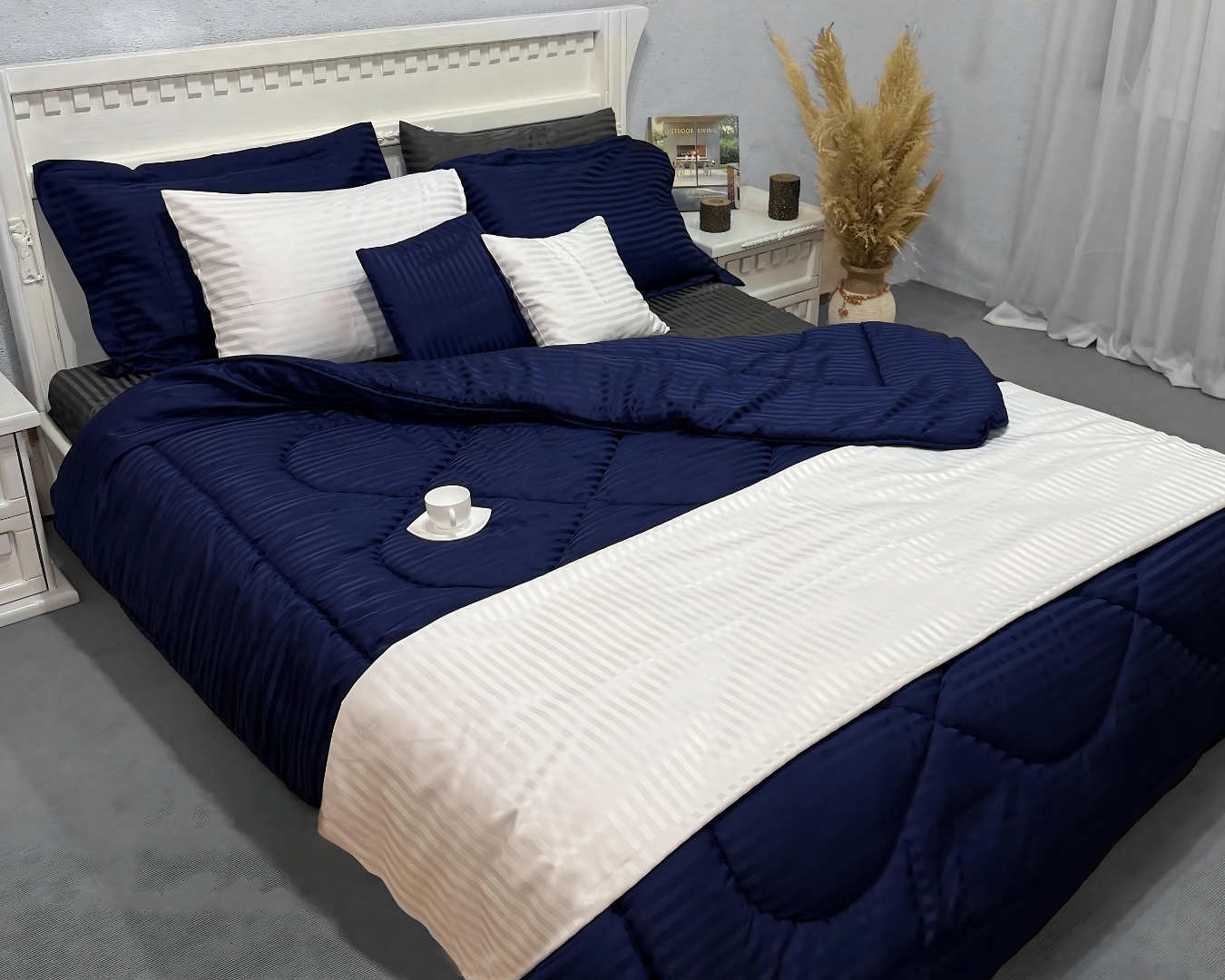 ست لحاف دونفره ٦ تکه؛ شامل: لحاف دورویه(زیره: میکرو، رویه: هتلی ژاکارد) - ملحفه کشدار میکرو ساده ١٦٠ یا ١٨٠ (به درخواست مشتری) - ٢