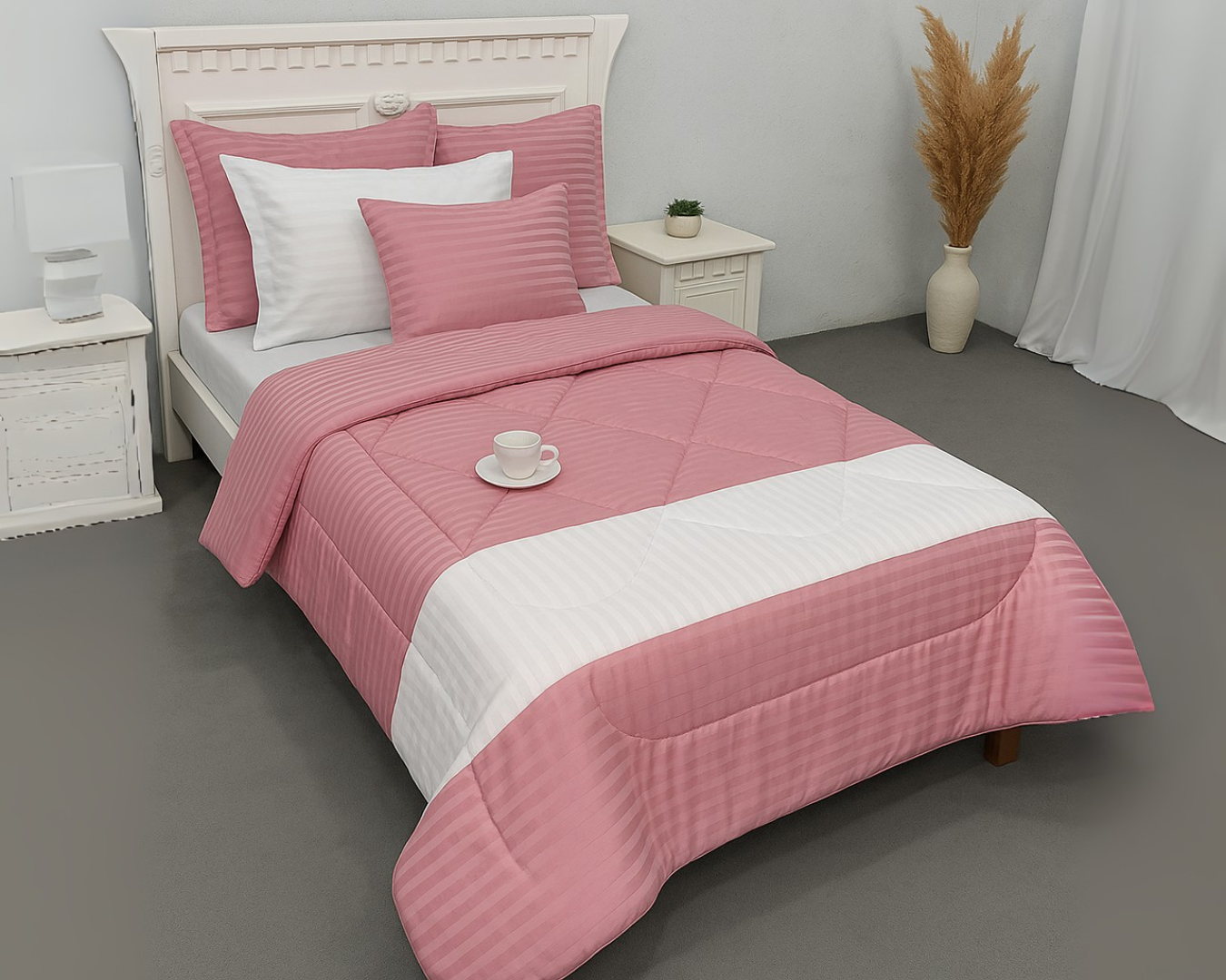 ست لحاف تکنفره ٤ تکه؛ شامل: لحاف دورویه(زیره: میکرو، رویه: هتلی ژاکارد) - ملحفه کشدار میکرو ساده - ١ عدد روبالشتی هتلی ژاکارد - ١ عدد روبالشتی میکرو ساده.