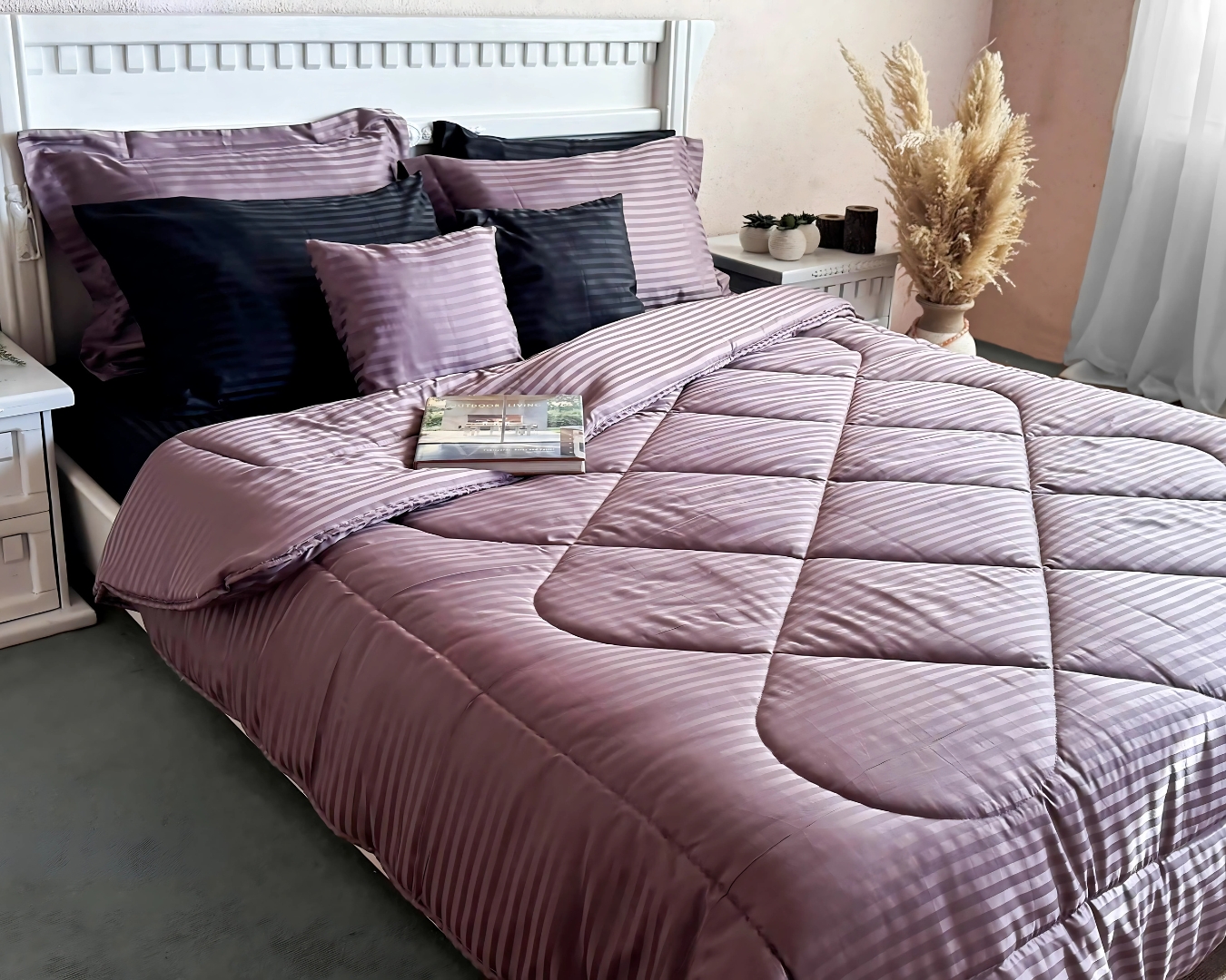 ست لحاف دونفره ٦ تکه؛ شامل: لحاف دورویه(زیره: میکرو، رویه: هتلی ژاکارد) - ملحفه کشدار میکرو ساده ١٦٠ یا ١٨٠ (به درخواست مشتری) - ٢ عدد روبالشتی لبهدار هتلی - ٢ عدد روبالشتی میکرو ساده.
