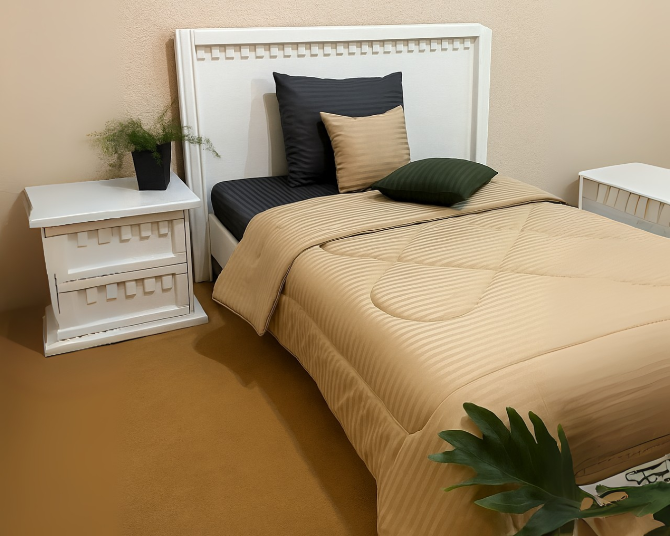 ست لحاف تکنفره ٤ تکه؛ شامل: لحاف دورویه(زیره: میکرو، رویه: هتلی ژاکارد) - ملحفه کشدار میکرو ساده - ١ عدد روبالشتی هتلی ژاکارد - ١ عدد روبالشتی میکرو ساده.