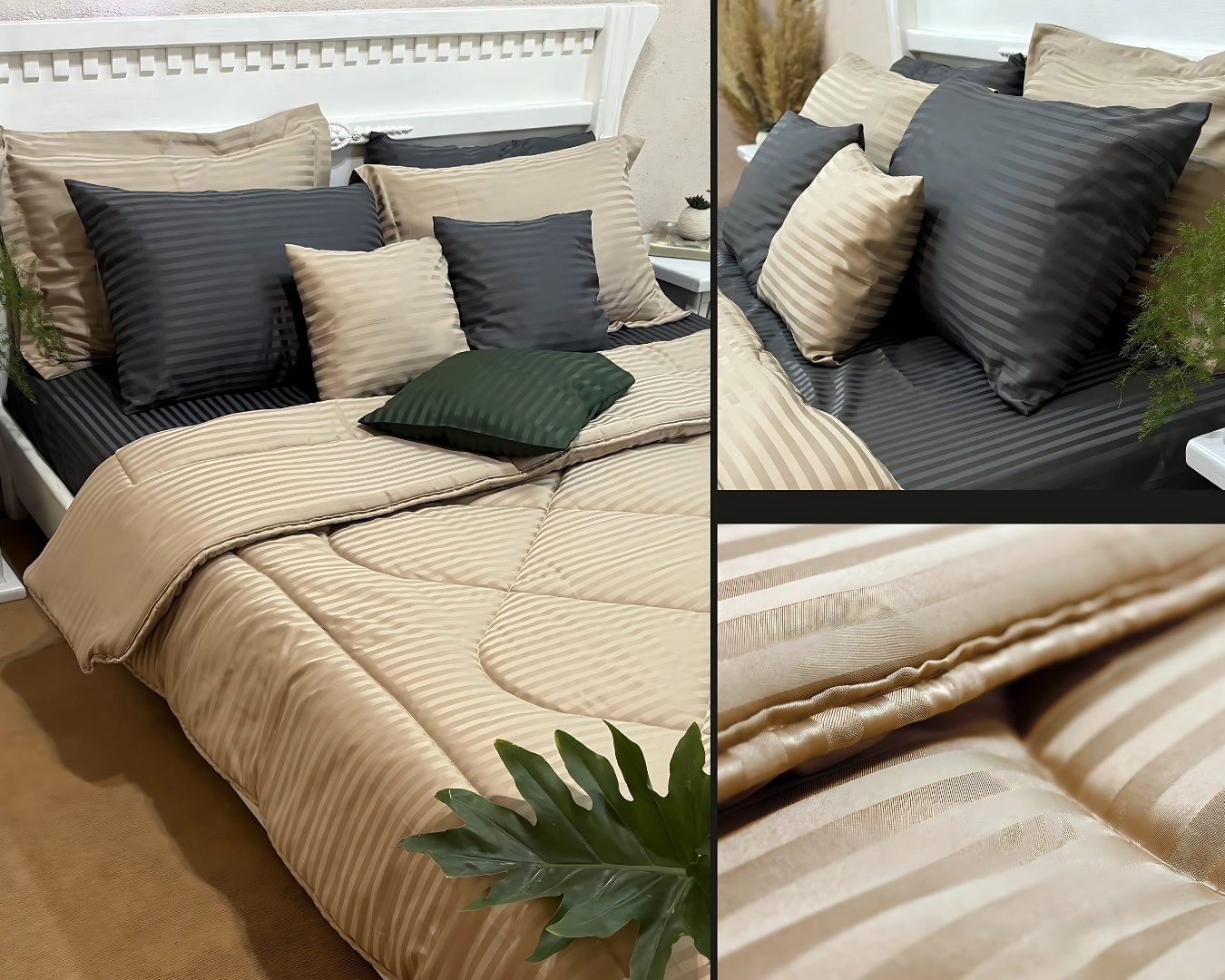 ست لحاف دونفره ٦ تکه؛ شامل: لحاف دورویه(زیره: میکرو، رویه: هتلی ژاکارد) - ملحفه کشدار میکرو ساده ١٦٠ یا ١٨٠ (به درخواست مشتری) - ٢ عدد روبالشتی لبهدار هتلی - ٢ عدد روبالشتی میکرو ساده.