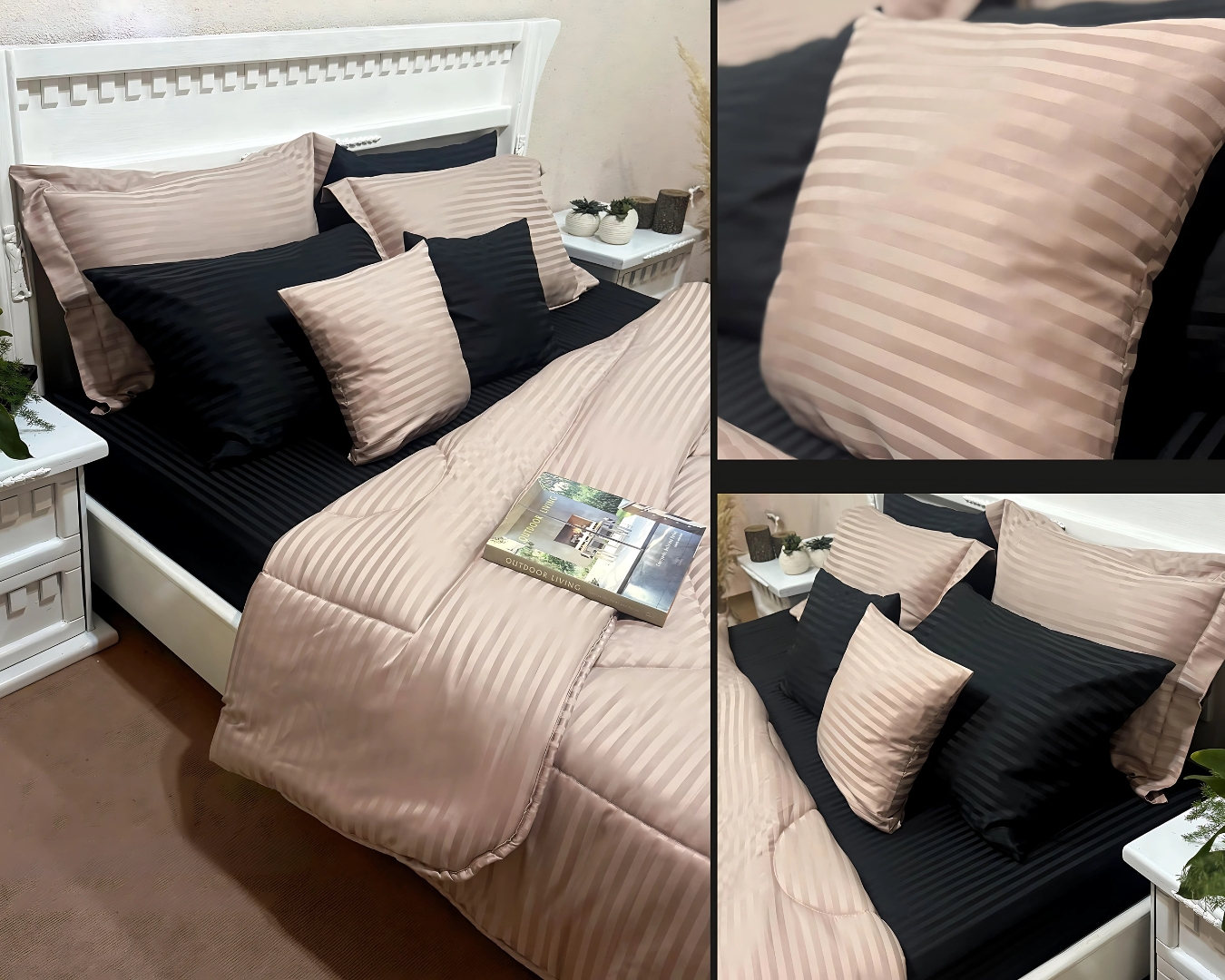 ست لحاف دونفره ٦ تکه؛ شامل: لحاف دورویه(زیره: میکرو، رویه: هتلی ژاکارد) - ملحفه کشدار میکرو ساده ١٦٠ یا ١٨٠ (به درخواست مشتری) - ٢ عدد روبالشتی لبهدار هتلی - ٢ عدد روبالشتی میکرو ساده.